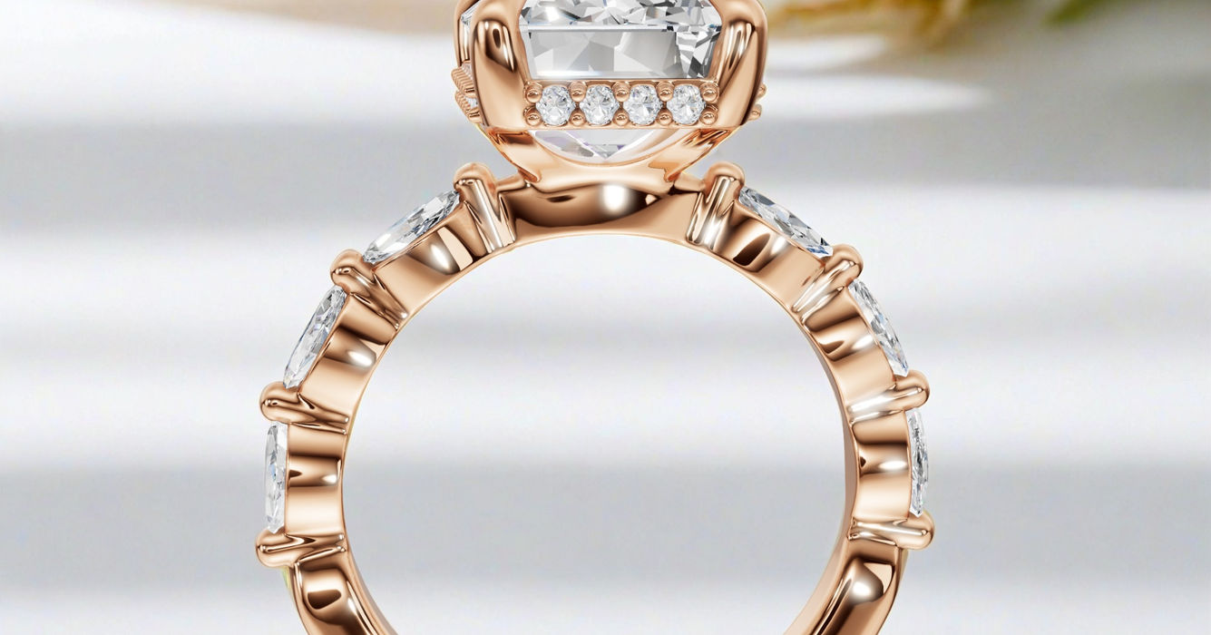 A radiant-cut diamond emanates brilliance, while marquise diamonds cascade along the golden band—each facet capturing and amplifying luminosity, creating a ring that truly lives up to its name.