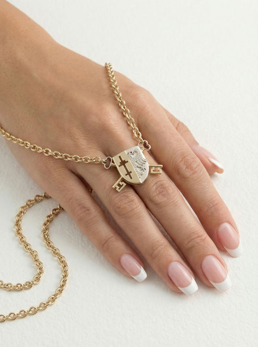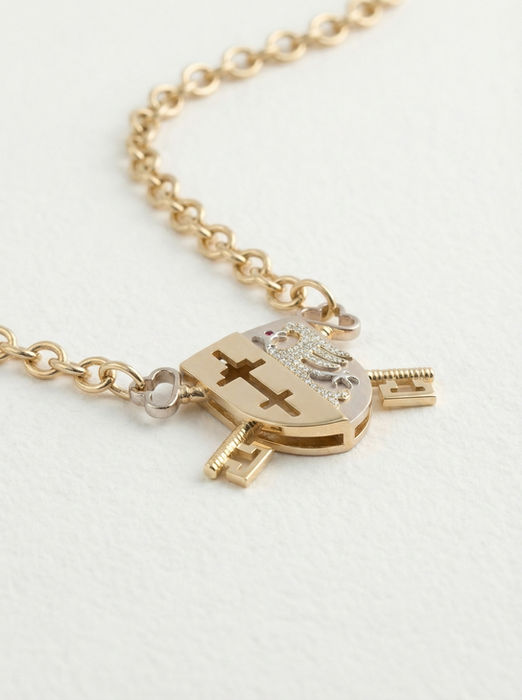 A masterful, bi-metal designer pendant that speaks of heritage. The shield features a striking cross motif alongside a pavé diamond eagle with a ruby eye, flanked by symbolic gold keys.