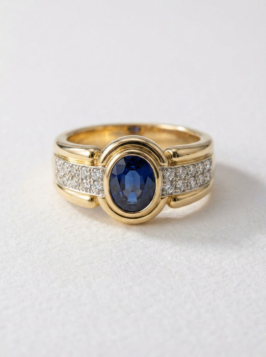 This captivating designer ring marries classic elegance with modern form. A deep blue, oval sapphire is bezel-set in polished gold, powerfully framed by twin channels of brilliant pavé diamonds.